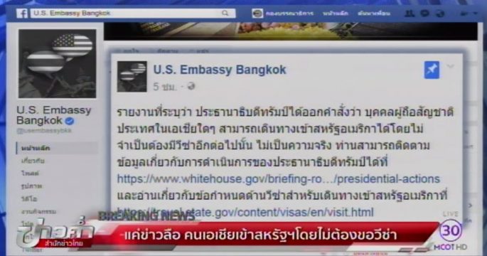สถานเอกอัครราชทูตสหรัฐอเมริกาประจำประเทศไทย ยืนยันข่าวลือประธานาธิบดีคนใหม่ลงนามให้คนเอเชียเข้าสหรัฐได้ไม่ต้องขอวีซ่า ไม่เป็นความจริง