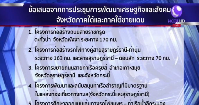 หลังเสร็จภารกิจที่ จ.ปัตตานี นายกรัฐมนตรี และ ครม.เดินทางไปที่ จ.สงขลา เพื่อเข้าร่วมประชุมการพัฒนาเศรษฐกิจและสังคมจังหวัดภาคใต้และภาคใต้ชายแดน เบื้องต้นหอการค้าภาคใต้เตรียมเสนอ 14 โครงการสำคัญเพื่อพัฒนาภาคใต้