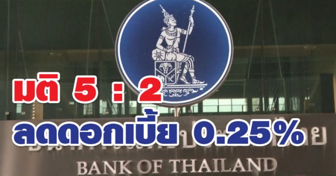 กนง.มีมติ 5 : 2 ลดดอกเบี้ย 0.25% จาก 1.75% เป็น 1.50% ต่อปี โดยให้มีผลทันที