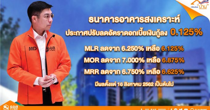 ธอส.ประกาศปรับลดอัตราดอกเบี้ยเงินกู้ลงร้อยละ 0.125 มีผลบังคับใช้ตั้งแต่วันที่ 16 สิงหาคม 2562 เป็นต้นไป หวังลดภาระลูกหนี้