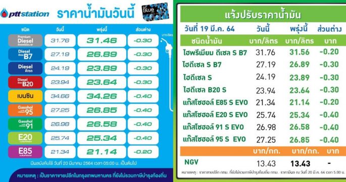ปตท. บางจาก ปรับลดราคาขายปลีกน้ำมันกลุ่มเบนซินและแก๊สโซฮอล์ทุกชนิดลง 40 สตางค์ต่อลิตร เว้น E85 ลดลง 20 สตางค์ต่อลิตร ส่วนกลุ่มดีเซล ลดลง 30 สตางค์ต่อลิตร มีผล 20 มี.ค.64 เวลา 05.00 น. เป็นต้นไป