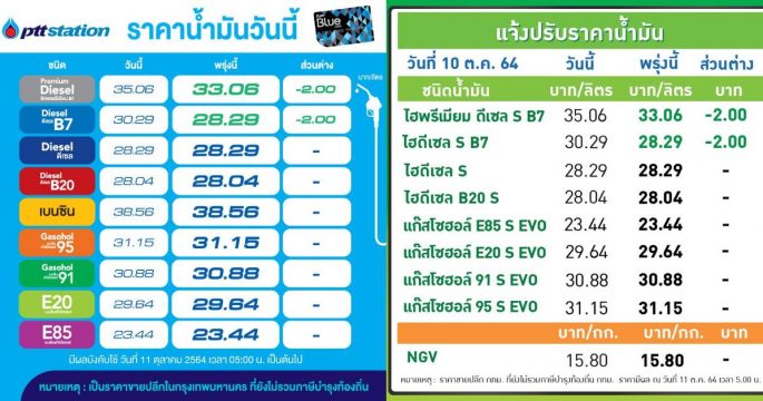 PTT Station ปรับลดราคาน้ำมันดีเซล B7 และดีเซลพรีเมี่ยม B7 ลง 2.00 บาทต่อลิตร ส่วนน้ำมันทุกชนิด คงเดิม มีผล 11 ต.ค.64 เวลา 05.00 น. เป็นต้นไป