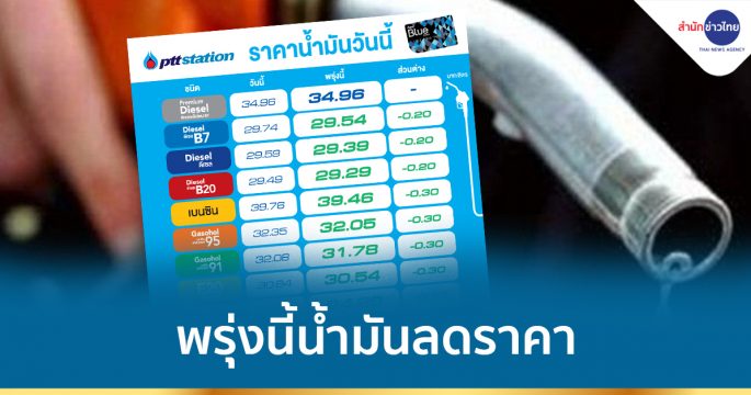 PTT Station-บางจากฯ ปรับลดราคาขายปลีกน้ำมันกลุ่มเบนซินและแก๊สโซฮอล์ทุกชนิดลง 60 สตางค์/ลิตร เว้น E85 ลดลง 40 สตางค์/ลิตร ส่วนกลุ่มดีเซลทุกชนิด ลดลง 40 สตางค์/ลิตร