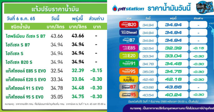 PTT Station-บางจากฯ ปรับลดราคาขายปลีกน้ำมันกลุ่มเบนซินและแก๊สโซฮอล์ทุกชนิดลง 30 สตางค์/ลิตร เว้น E85 ลดลง 15 สตางค์/ลิตร ส่วนกลุ่มดีเซลคงเดิม มีผล 7 ธ.ค. 2565 เวลา 05.00 น. เป็นต้นไป