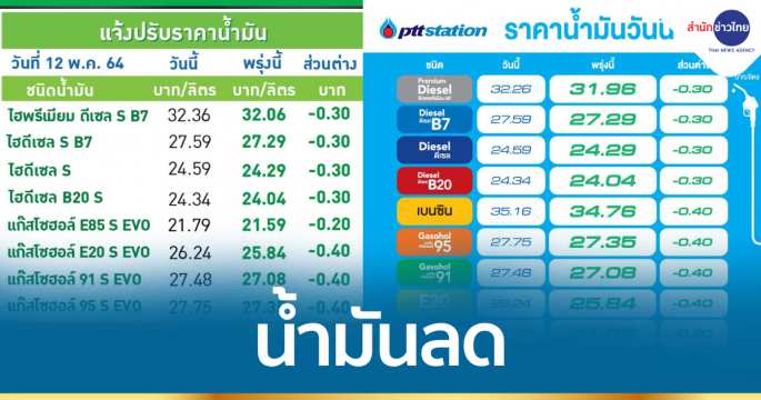 PTT Station บางจากฯ ปรับลดราคาขายปลีกน้ำมันกลุ่มเบนซิน-แก๊สโซฮอล์ทุกชนิดลง 0.40 บาท/ลิตร เว้น E85 ลดลง 0.20 ส่วนกลุ่มดีเซล ทุกชนิด ลดลง 0.30 บาท/ลิตร มีผลพรุ่งนี้ (13 พ.ค.)