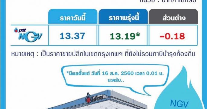 ปตท.ลดราคาเอ็นจีวี 18 สต./กก. มีผล 16 ส.ค. ราคาใหม่อยู่ที่ 13.19 บาท/กก.