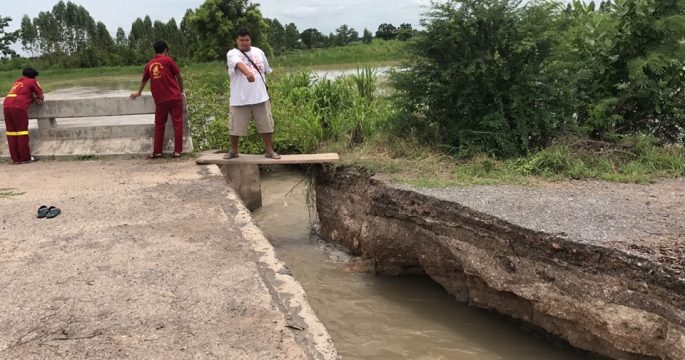ลพบุรี 9 ก.ค.-คืบหน้าสถานการณ์น้ำท่วมลพบุรี ล่าสุดน้ำป่าจากอำเภอสระโบสถ์ ไหลลงสู่อำเภอโคกสำโรงแล้ว กัดเซาะคอสะพานเข้าออกหมู่บ้านในตำบลเกาะแก้วขาด ทำให้ชาวบ้านได้รับความเดือดร้อน ต้องอ้อมไปใช้เส้นทางอื่นที่ไกลกว่าแทน หลังจากที่เกิดฝนตกหนักจนเกิดน้ำป่าไหลเข้าท่วมในพื้นที่ 5 หมู่บ้าน ของ ต.มหาโพธิ์ อ.สระโบสถ์ จ.ลพบุรี เมื่อ 3 วันก่อน ล่าสุดขณะนี้มวลน้ำทั้งหมดได้ไหลลงมาสู่บ้านเกาะแก้ว ต.เกาะแก้ว อ.โคกสำโรง จ.ลพบุรี แล้ว พร้อมกับได้กัดเซาะคอสะพานทางเข้าหมู่บ้านเกาะแก้วไปบ้านหน้าพระ หมู่ที่ 6 ต.เกาะแก้ว จนขาดเป็นแนวกว้างกว่า 2 เมตร ทำให้ไม่สามารถสัญจรใช้ ชาวบ้านต้องต้องอ้อมไปใช้เส้นทางอื่นที่ไกลกว่าแทน เบื้องต้นนายภานุ แย้มศรี ผู้ว่าราชการจังหวัดลพบุรี ได้สั่งการให้ป้องกันและบรรเทาสาธารณภัยจังหวัดลพบุรี ลงพื้นที่ตรวจสอบ พบว่ามวลน้ำที่ไหลลงมาจากอำเภอสระโบสถ์มีจำนวนมาก แต่ยังไม่ได้สร้างความเดือดร้อนท่วมบ้านเรือนชาวบ้าน เพราะมวลน้ำทั้งหมดยังอยู่ในลำคลองและพื้นที่นาเป็นส่วนใหญ่ ยกเว้นคอสระพานที่ถูกน้ำกัดเซาะขาดเท่านั้น อย่างไรก็ตาม จังหวัดได้สั่งให้เฝ้าระวัง เกรงว่าหากมีฝนตกลงมาซ้ำ อาจทำให้น้ำป่าไหลเข้าท่วมบ้านเรือนชาวบ้านได้ ส่วนคอสะพานที่ขาด ขณะนี้จังหวัดได้ประสานกับองค์การบริหารส่วนจังหวัดให้เข้ามาช่วยซ่อมแซม เพื่อให้ชาวบ้านสามารถสัญจรไปมาได้ชั่วคราวก่อน.-สำนักข่าวไทย