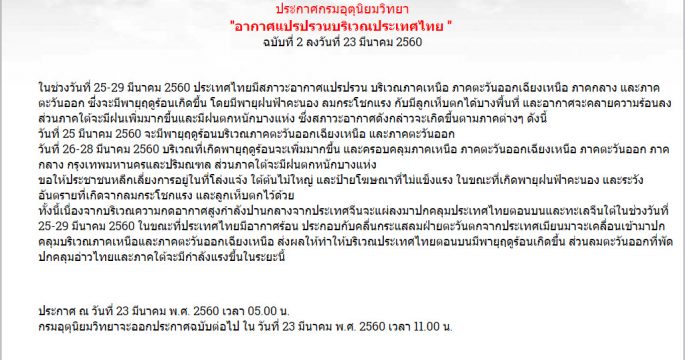 กรมอุตุฯ เตือนไทยมีสภาวะอากาศแปรปรวน ช่วงวันที่ 25-29 มี.ค.นี้ บริเวณภาคเหนือ ภาคตะวันออกเฉียงเหนือ ภาคกลาง และภาคตะวันออก โดยจะมีพายุฤดูร้อนเกิดขึ้น
