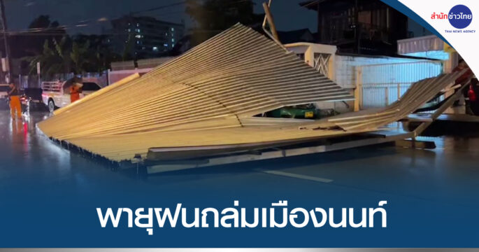 พายุฝนถล่มเมืองนนทบุรี ลมกระโชกแรงพัดหลังคาโครงเหล็กบนอาคารสูงปลิวข้ามฝั่งถนนตกลงมาทับรถยนต์ได้รับความเสียหาย ใกล้ตลาดสดเทศบาลนครนนทบุรี ไม่มีผู้บาดเจ็บหรือเสียชีวิต