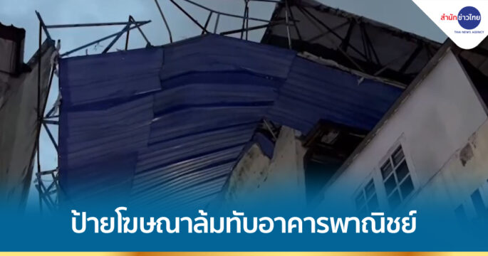 ฝนถล่ม จ.นนทบุรี ป้ายโฆษณาบนอาคารพาณิชย์หักล้มทับบ้านเรือนประชาชนและรถยนต์ได้รับความเสียหาย