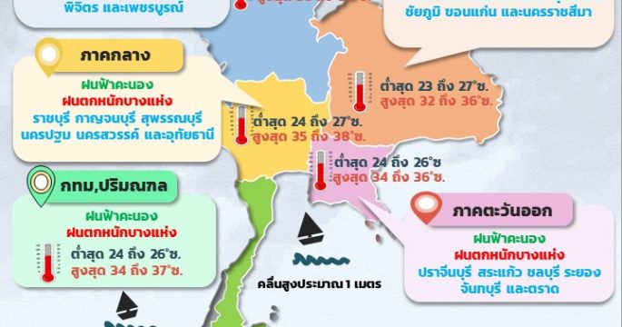กรมอุตุฯ พยากรณ์อากาศ 24 ชม.ข้างหน้า ประเทศไทยมีฝนตกหนักบางแห่งในภาคเหนือ ภาคอีสานตอนบน ภาคตะวันออก ภาคกลาง และภาคใต้ ขณะที่ กทม.-ปริมณฑล มีฝนฟ้าคะนอง 30% ของพื้นที่ ตกหนักบางแห่ง