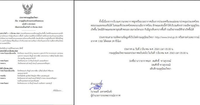 กรมอุตุนิยมวิทยา 3 มี.ค.- กรมอุตุฯ เตือน 3-5 มี.ค. ไทยตอนบนจะมีพายุฤดูร้อนเกิดขึ้น โดยมีลักษณะของพายุฝนฟ้าคะนอง ลมกระโชกแรง กับมีลูกเห็บตกบางพื้นที่ โดยจะเริ่มในภาคอีสานก่อน และจะมีผลกระทบในภาคอื่นๆ ในระยะต่อไป ขอประชาชนระวังอันตราย หลีกเลี่ยงการอยู่ในที่โล่งแจ้ง ใต้ต้นไม้ใหญ่ สิ่งปลูกสร้าง และป้ายโฆษณาที่ไม่แข็งแรง กรมอุตุนิยมวิทยาประกาศ “พายุฤดูร้อนบริเวณประเทศไทยตอนบน (มีผลกระทบตั้งแต่วันที่ 3-5 มีนาคม 2563)” ฉบับที่ 4 ลงวันที่ 03 มีนาคม 2563 ระบุในช่วงวันที่ 3-5 มีนาคม 2563 ประเทศไทยตอนบนจะมีพายุฤดูร้อนเกิดขึ้น โดยมีลักษณะของพายุฝนฟ้าคะนอง ลมกระโชกแรง กับมีลูกเห็บตกบางพื้นที่ รวมถึงอาจจะมีฟ้าผ่าเกิดขึ้นได้ ขอให้ประชาชนบริเวณประเทศไทยตอนบนระวังอันตรายจากฝนฟ้าคะนองและลมกระโชกแรงที่จะเกิดขึ้น โดยหลีกเลี่ยงการอยู่ในที่โล่งแจ้ง ใต้ต้นไม้ใหญ่ สิ่งปลูกสร้าง และป้ายโฆษณาที่ไม่แข็งแรง สำหรับเกษตรกรควรเตรียมการป้องกันและระวังความเสียหายที่จะเกิดต่อผลผลิตทางการเกษตรไว้ด้วย จังหวัดที่คาดว่าจะได้รับผลกระทบ มีดังนี้ ในวันที่ 3 มีนาคม 2563 ภาคตะวันออกเฉียงเหนือ : จังหวัดเลย […]
