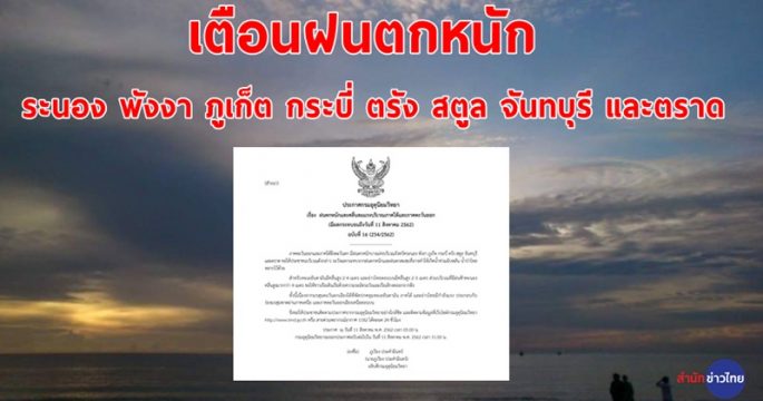 กรมอุตุฯ เตือนภาคตะวันออกและภาคใต้ฝั่งตะวันตกมีฝนตกหนักบางแห่งบริเวณ จ.ระนอง พังงา ภูเก็ต กระบี่ ตรัง สตูล จันทบุรี และตราด ทะเลคลื่นสูง บริเวณที่มีฝนฟ้าคะนองคลื่นสูงมากกว่า 4 เมตร เรือเล็กงดออกจากฝั่ง ขณที่ กทม.-ปริมณฑล ฝนฟ้าคะนอง 60%