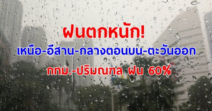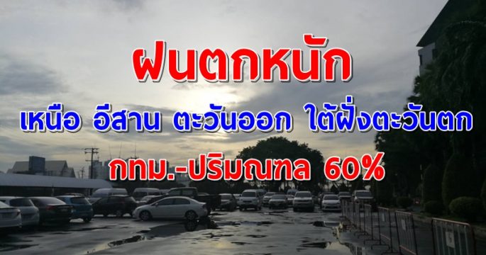 กรมอุตุฯ เผยไทยมีฝนตกต่อเนื่อง และมีฝนตกหนักบางพื้นที่บริเวณภาคเหนือ ภาคอีสาน ภาคตะวันออก และภาคใต้ฝั่งตะวันตก ส่วน กทม.-ปริมณฑล ฝนฟ้าคะนอง 60% ของพื้นที่