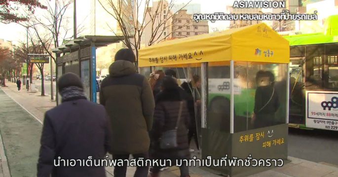 ลมหนาวที่เกาหลีใต้ ทำให้เกิดความคิดสร้างสรรค์ในการหาวิธีคลายหนาว เจ้าหน้าที่เห็นใจชาวกรุงโซลที่ใช้รถประจำทางที่ต่างต้องรอรถข้างถนนแบบทนหนาว จึงเอาเต็นท์พลาสติกมาทำเป็นที่พักชั่วคราวกันลมหนาว ตั้งไว้บริเวณป้ายรถเมล์รวม 30 จุด ทั่วกรุงโซล