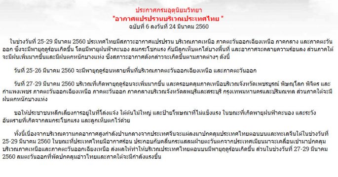 อุตุฯ เตือนไทยอากาศแปรปรวน ช่วง 25-29 มี.ค. บริเวณภาคเหนือ อีสาน กลาง และภาคตะวันออก จะมีพายุฤดูร้อนเกิดขึ้นและลมกระโชกแรง กับมีลูกเห็บตกบางพื้นที่ และอากาศจะคลายความร้อนลง ส่วนภาคใต้จะมีฝนเพิ่มมากขึ้น