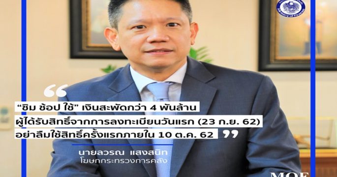 กรุงเทพฯ 9 ต.ค. – คลังเผย “ชิมช้อปใช้” 12 วันแรก มีการใช้จ่ายกว่า 4,000 ล้านบาท เตือนผู้ได้รับสิทธิ์วันแรก อย่าลืมใช้จ่ายครั้งแรกพรุ่งนี้วันสุดท้าย นายลวรณ แสงสนิท ผู้อำนวยการสำนักงานเศรษฐกิจการคลัง ในฐานะโฆษกกระทรวงการคลัง เปิดเผยว่า ในการลงทะเบียนรับสิทธิ์มาตรการ “ชิมช้อปใช้” มีผู้ลงทะเบียนครบจำนวนทุกวัน โดยตั้งแต่วันที่ 3 ตุลาคม 2562 เป็นต้นมา เปิดให้มีการลงทะเบียนเก็บตกตามสิทธิ์ที่ยังคงเหลือ ล่าสุดมีผู้ได้รับสิทธิ์ใกล้ครบ 10 ล้านรายแล้ว โฆษกกระทรวงการคลัง กล่าวว่า การตรวจสอบสิทธิ์ผู้ลงทะเบียน 14 วันแรกเสร็จสิ้นแล้ว โดยมีผู้ได้รับสิทธิ์ 9,939,590 ราย ซึ่งผู้ลงทะเบียน 13 วันแรกได้รับ SMS ยืนยันสิทธิ์แล้ว 9,693,845 ราย ทั้งนี้ มีผู้เข้ายืนยันตัวตนในแอปพลิเคชัน “เป๋าตัง” แล้ว 8,854,072 ราย โดยยืนยันตัวตนสำเร็จ 7,934,311 ราย และมีผู้ที่ยังไม่ได้ติดตั้งแอปพลิเคชัน […]