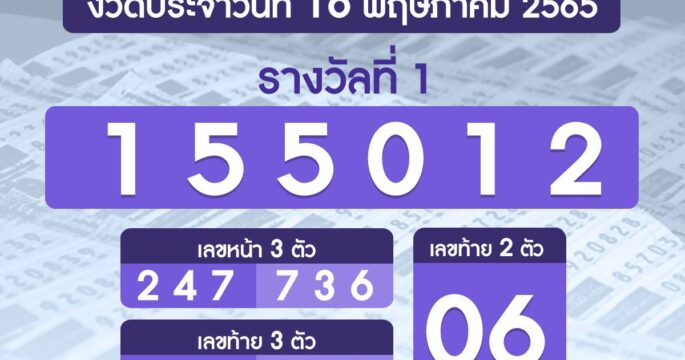 ผลรางวัลสลากกินแบ่งรัฐบาล งวดวันที่ 16 พฤษภาคม 2565