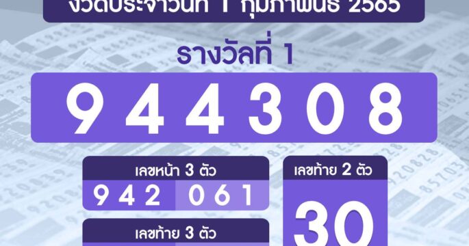 ผลรางวัลสลากกินแบ่งรัฐบาล งวดวันที่ 1 กุมภาพันธ์ 2565