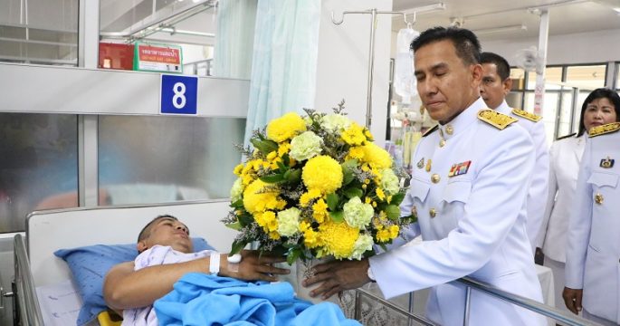 พระบาทสมเด็จพระเจ้าอยู่หัว พระราชทานแจกันดอกไม้และสิ่งของพระราชทานเยี่ยมอาการบาดเจ็บตำรวจตระเวนชายแดน 4 นาย ที่ถูกคนร้ายลอบวางระเบิดขณะปฏิบัติหน้าที่ ในพื้นที่ ต.ท่าม่วง อ.เทพา จ.สงขลา