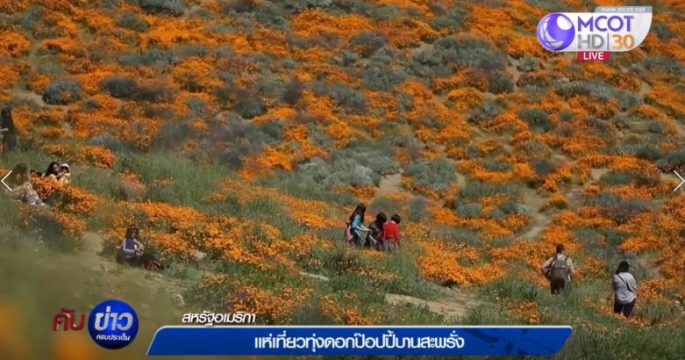 นักท่องเที่ยว แห่ชมทุ่งดอกป๊อปปี้สีเหลืองสดที่บานสะพรั่งปกคลุมทั่วทั้งหุบเขา ใกล้ทะเลสาบเอลซินอร์ นอกนครลอสแอนเจลิส จะเกิดขึ้นเพียง 1 ครั้งในรอบ 10 ปีเท่านั้น