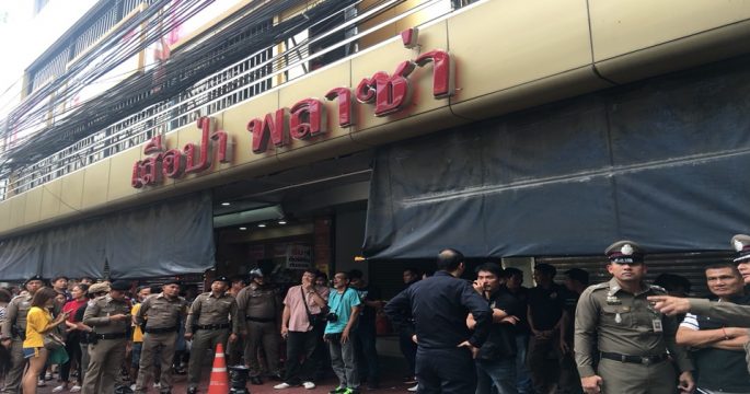 ตำรวจบุกค้นอาคารเสือป่าพลาซ่า ยึดเคสโทรศัพท์เลียนแบบยี่ห้อดังและละเมิดลิขสิทธิ์การ์ตูนเรื่อง onepiece มูลค่าความเสียหายกว่า 20 ล้าน พร้อมจับกุมผู้ต้องหาได้15คน