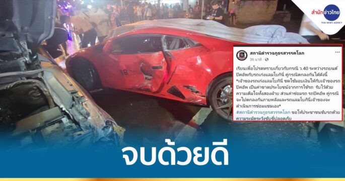 จบด้วยดี เหตุรถหรูลัมโบร์กินี และรถปิกอัพ ชนกลางแยกสนามบินสุโขทัย สภาพพังยับ ชาวเน็ตวิจารณ์สนั่น ด้านตำรวจเผยเจ้าของรถหรูจ่ายชดเชยค่าเสียหายแล้ว