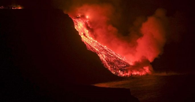 ลา ปาลมา 29 ก.ย. – ลาวาสีแดงร้อนระอุที่ทะลักออกมาจากภูเขาไฟปะทุที่ทำลายพื้นที่บนเกาะลา ปาลมา ของสเปนเป็นวันที่เก้า กำลังไหลลงสู่มหาสมุทรแอตแลนติกในช่วงค่ำวันอังคารตามเวลาท้องถิ่น ขณะที่เจ้าหน้าที่ท้องถิ่นเตือนว่า ลาวาที่ไหลลงทะเลอาจทำให้เกิดการระเบิดและควันก๊าซพิษ สำนักข่าวรอยเตอร์สรายงานอ้างภาพถ่ายที่แสดงให้เห็นกลุ่มควันไอน้ำสีขาวที่พวยพุ่งขึ้นมาจากพื้นที่ปลายา นูเอวา ในขณะที่ลาวาไหลลงสู่มหาสมุทร ขณะที่เจ้าหน้าที่ท้องถิ่นบนเกาะลา ปาลมา กล่าวว่า ลาวาที่ไหลลงสู่ทะเลอาจทำให้เกิดการระเบิดและควันก๊าซพิษ ส่วนหน่วยงานด้านฉุกเฉินของหมู่เกาะคานารีเตือนให้ผู้ที่อยู่ในสถานที่กลางแจ้งรีบหาที่หลบภัยในทันที และขณะนี้ยังไม่ได้รับรายงานว่ามีผู้บาดเจ็บจากเหตุดังกล่าว ก่อนหน้านี้ ลาวาได้ไหลทะลักออกมาทางด้านตะวันตกของภูเขาไฟคุมเบร วีฮาและมุ่งหน้าไหลลงทะเลตั้งแต่เมื่อวันที่ 19 กันยายน ทำให้บ้านเรือนเสียหายเกือบ 600 หลังและทำลายพื้นที่ปลูกกล้วยจำนวนมากบนเกาะลา ปาลมา ที่ตั้งอยู่ใกล้กับเกาะเตเนริเฟในหมู่เกาะคานารีของสเปน ซึ่งตั้งอยู่นอกชายฝั่งทางเหนือของทวีปแอฟริกา ขณะที่ทางการได้อพยพประชาชนหลายพันคนไปอยู่ในที่ปลอดภัยและประกาศใช้มาตรการล็อกดาวน์ 3 ชุมชนริมชายฝั่งเมื่อวันจันทร์ที่อยู่ในเส้นทางที่ลาวาไหลลงทะเล ทั้งนี้ ทางการสเปนได้ประกาศให้เกาะลา ปาลมา เป็นเขตภัยพิบัติเมื่อวันอังคารเพื่อให้รัฐบาลอนุมัติเงินสนับสนุนเพื่อช่วยเหลือประชาชนที่ได้รับความเดือดร้อนจากเหตุภูเขาไฟปะทุ.-สำนักข่าวไทย