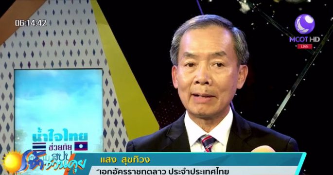 เอกอัครราชทูตลาวประจำประเทศไทย เผยน้ำท่วมในแขวงอัตตะบือและจำปาสักเริ่มลดลงแล้ว แต่รัฐบาล สปป.ลาว ยังต้องแก้ไขให้ชีวิตความเป็นอยู่ของประชาชนกลับคืนสู่ภาวะปกติ พร้อมขอขอบคุณช่อง 9 MCOT HD ที่จัดรายการช่วยระดมทุน และขอบคุณรัฐบาลไทยที่ช่วยเหลือ สปป.ลาว