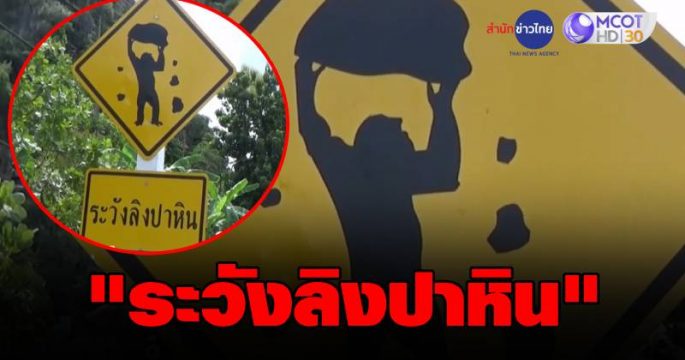 ป้ายเตือน “ระวังลิงปาหิน” ทางขึ้นเขาติง จ.ตรัง หวังให้รถชะลอความเร็ว หวั่นชนลิงตายและป้องกันอุบัติเหตุ