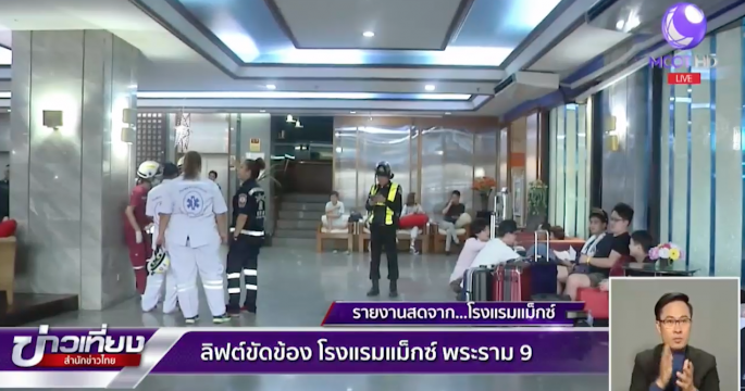 เกาะติดเหตุลิฟต์ขัดข้อง โรงแรมแม็กซ์ ย่านพระราม 9 นายนพพร พรเจริญ ผู้จัดการห้องอาหาร ยืนยันไม่มีคนติดอยู่ในลิฟต์ขณะเกิดเหตุการณ์ขัดข้อง ขณะนี้อยู่ระหว่างตรวจสอบลิฟต์ทุกตัว ให้สามารถกลับมาใช้ได้โดยเร็วที่สุด เพื่อไม่ให้กระทบกับแขกของทางโรงแรม