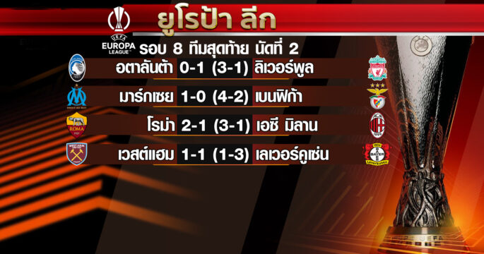 ลิเวอร์พูล กับ เวสต์แฮม ยูไนเต็ด สองทีมจากอังกฤษ ตกรอบ 8 ทีมสุดท้าย ศึกยูโรป้า ลีก