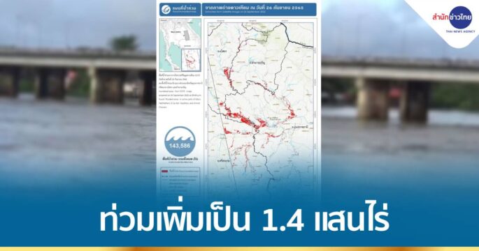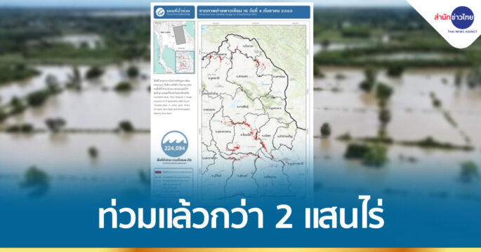 GISTDA เผยข้อมูลจากดาวเทียม พบน้ำท่วมขังในพื้นที่บางส่วนของลุ่มน้ำชี ลุ่มน้ำมูล และลุ่มน้ำโขงตะวันออกเฉียงเหนือ รวมทั้งสิ้น 224,094 ไร่