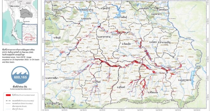 GISTDA เผยข้อมูลจากดาวเทียม ICEYE พบน้ำท่วมขังหลายพื้นที่ของลุ่มน้ำชีและลุ่มน้ำมูล รวมทั้งสิ้น 600,165 ไร่