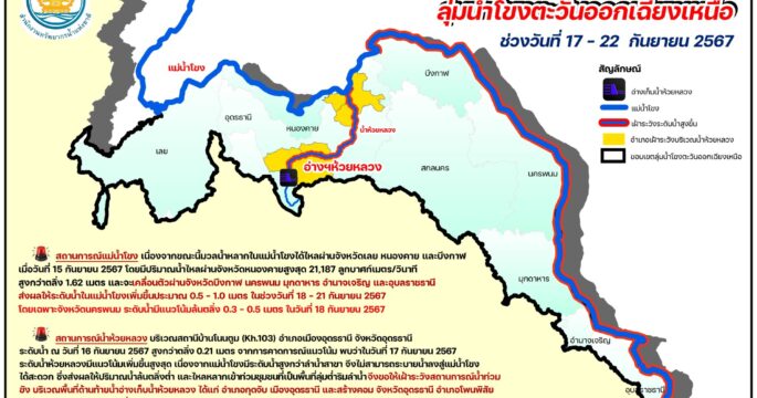 สำนักงานทรัพยากรน้ำแห่งชาติ ออกประกาศแจ้งเตือนให้เฝ้าระวังสถานการณ์น้ำบริเวณลุ่มน้ำโขงตะวันออกเฉียงเหนือ คาดพรุ่งนี้ (18 ก.ย.) น้ำจะล้นตลิ่งที่ จ.นครพนม รวมถึงริมลำน้ำห้วยหลวง จ.อุดรธานี ตลอดจนพื้นที่ด้านท้ายอ่างเก็บน้ำห้วยหลวง จ.อุดรธานี และหนองคาย