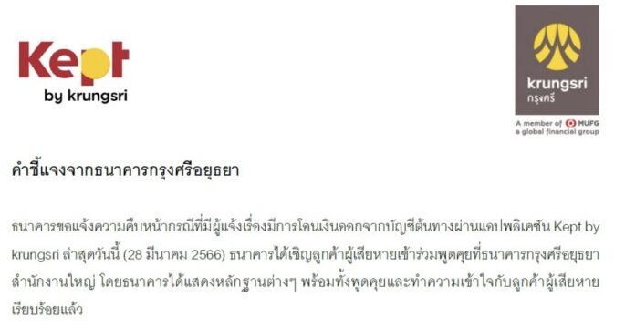 กรุงเทพฯ 28 มี.ค.-ธนาคารกรุงศรีอยุธยา (BAY) ชี้แจงกรณีมีผู้โพสต์ลงโซเชียลมีเดียว่าถูกลักลอบถอนเงินฝากดิจิทัลอยู่ในแอปพลิเคชัน Kept by krungsri กว่า 3 แสนบาท ธนาคารยยืนยันว่าลูกค้าทำธุรกรรมด้วยตัวเอง ระบบของธนาคารไม่ได้ถูกแฮ็ก