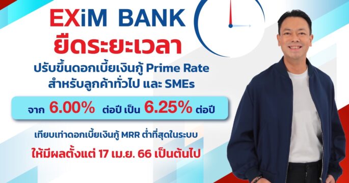 กรุงเทพฯ 3 เม.ย.-EXIM BANK ยืดเวลาปรับขึ้นดอกเบี้ยเงินกู้ถึง 17 เม.ย. นี้ คงจุดยืน “กล้า พัฒนาเพื่อคนไทย” ด้วยดอกเบี้ยต่ำสุดในระบบ