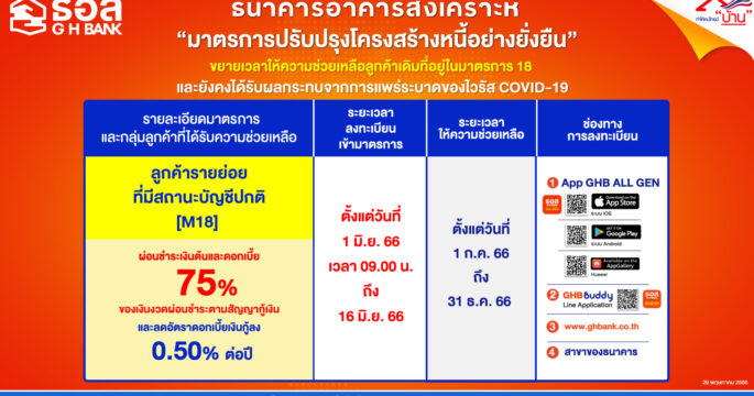 กรุงเทพฯ 29 พ.ค.-ธอส. ประกาศขยายมาตรการ 18 ช่วยเหลือลูกค้าสถานะบัญชีปกติ อีก 6 เดือน