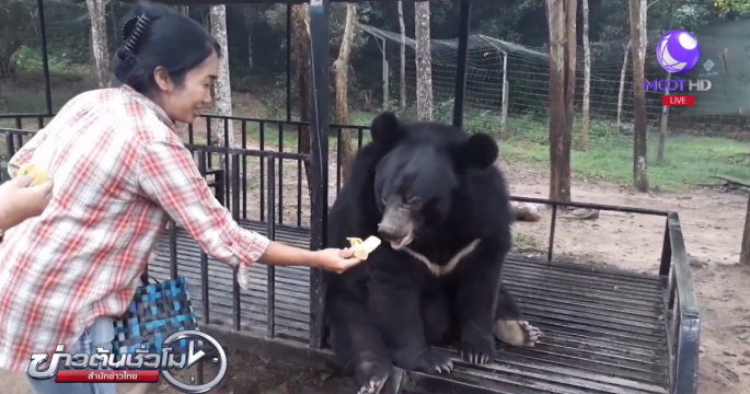 ชาวบ้านช่วยกันจับลูกหมีควายใส่กรงเตรียมนำส่งเจ้าหน้าที่ หลังถูกสุนัขเห่าไล่ต้อนออกจากป่าบริเวณหมู่บ้านใน ต.หนองแสง อ.ปากพลี จ.นครนายก