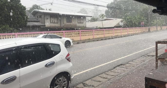 เกิดพายุลูกเห็บถล่มอำเภอเชียงคาน จังหวัดเลย อย่างหนักนานกว่า 30 นาที ทำให้มีลูกเห็บขาวโพลนเต็มพื้นดิน