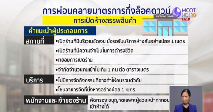 สธ.หารือผ่อนปรนมาตรการโควิด-19 เล็งเปิดบริการร้านค้าต่างๆ ตามความเสี่ยงต่ำและปานกลาง ทั้งสวนสาธารณะ ร้านตัดผม ห้างสรรพสินค้า แต่ห้ามเปิดเด็ดขาด ผับ บาร์ คาราโอเกะ สนามมวย