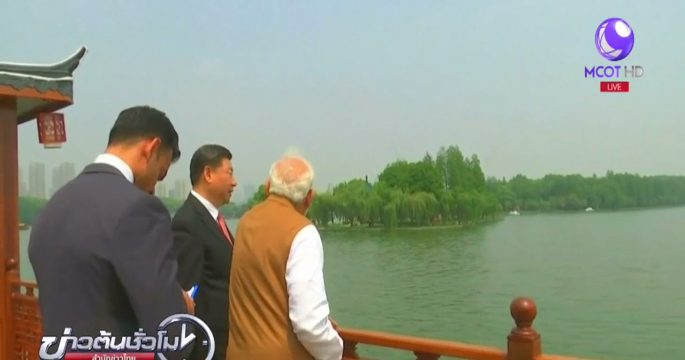 นายกรัฐมนตรีนเรนทรา โมดีของอินเดีย ล่องเรือกับประธานาธิบดีสี จิ้นผิงของจีน ที่เมืองอู่ฮั่น มณฑลเหอเป่ยในวันสุดท้ายของการเยือนจีน ซึ่งเป็นการพบอย่างไม่เป็นทางการมากกว่าจะเป็นการประชุมสุดยอด