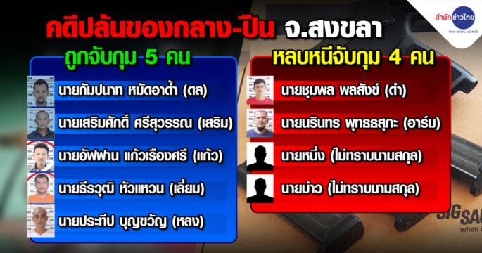 ผบช.ภ. 9 เผยผู้ก่อเหตุ บุกปล้นยาเสพติด-อาวุธปืน จากชุดปฏิบัติการพิเศษฝ่ายปกครอง อ.รัตภูมิ จ.สงขลา ขณะล่อซื้อยาเสพติด มีทั้งหมด 9 คน ล่าสุดจับตัวได้ 5 คน พรุ่งนี้ (22 ต.ค.) เตรียมออกหมายจับอีก 4 คน