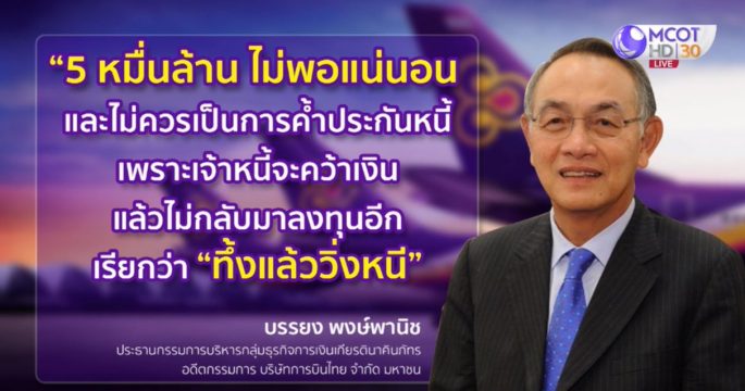 แต่ไม่ใช่ล้มละลาย ชี้ หากเข้าสู่กระบวนการศาล รัฐวิสาหกิจบินไทยต้องหลุด คณะกรรมการต้องหยุดบริหาร