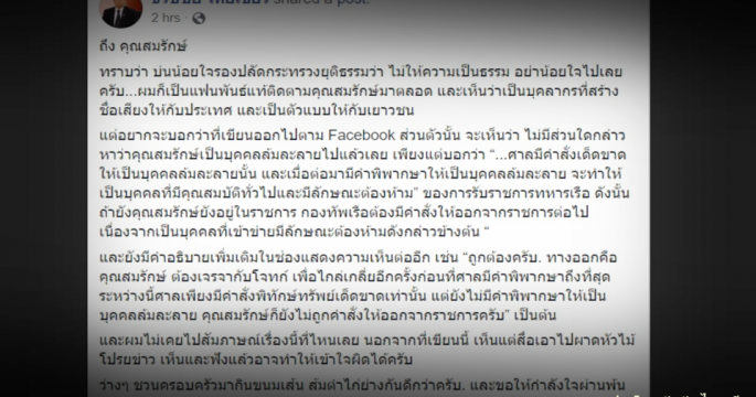 รองปลัด ยธ.ย้ำข้อความที่โพสต์เฟซบุ๊กไม่ได้กล่าวให้ร้าย’สมรักษ์’เป็นข้อเท็จจริงทางกฏหมาย ไม่จำเป็นต้องขอโทษ ย้ำหากจะฟ้องเรียกค่าเสียหายยังไม่ทราบจะร้องข้อหาใด