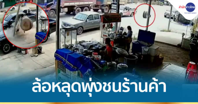 ล้อรถบรรทุกสิบล้อหลุดพุ่งเข้าร้านค้า โชคดีไม่มีคนบาดเจ็บ แต่เสาไฟฟ้าหักและรถยนต์จอดหน้าร้านได้รับความเสียหาย