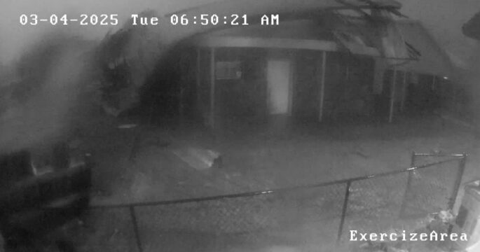 ภาพจากกล้องวงจรปิด เผยให้เห็นพายุทอร์นาโดกำลังแรงพัดถล่มบ้านเรือนในเมืองฮิวโก รัฐโอกลาโฮมาของสหรัฐ ช่วงเช้าตรู่วันอังคารตามเวลาท้องถิ่น