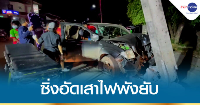 วงจรปิดจับภาพหนุ่มซิ่งกระบะชนอัดเสาไฟฟ้าข้างทาง กลางเมืองหนองคาย รถพังยับ ส่วนคนขับบาดเจ็บสาหัส