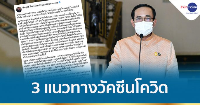 นายกฯ โพสต์เฟซบุ๊ก เดินหน้า 3 แนวทางเกี่ยวกับวัคซีนป้องกันโควิด-19 เพิ่มการจัดหาเป็น 150 ล้านโดส พร้อมเร่งฉีดวัคซีนเข็มแรก