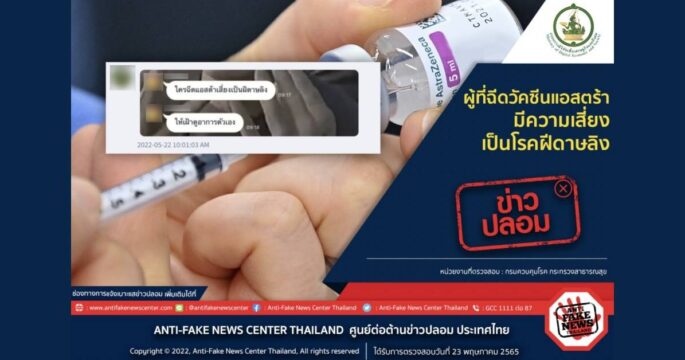 ศูนย์ต่อต้านข่าวปลอม เตือนข่าวปลอม อย่าแชร์ เรื่องผู้ฉีดวัคซีนแอสตร้า มีความเสี่ยงเป็นโรคฝีดาษลิง ตรวจสอบข้อเท็จจริงกับกรมควบคุมโรค ก.สาธารณสุข พบเป็นข้อมูลเท็จ การฉีดวัคซีนป้องกันโรคโควิด-19 ไม่มีความเสี่ยงต่อการเกิดโรคฝีดาษลิง